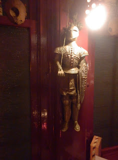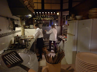Voor het overige herinnert alles ons aan dolce Italia. De met schelpen bepleisterde muren, de plaatjes van het land, de formica tafels en stoelen, de mandflessen aan het plafond. De ridder in harnas. De kleuren van de jaren zeventig. De familiaire sfeer.